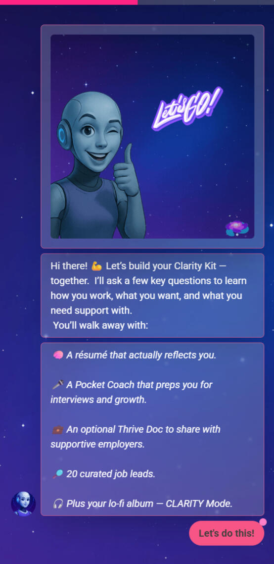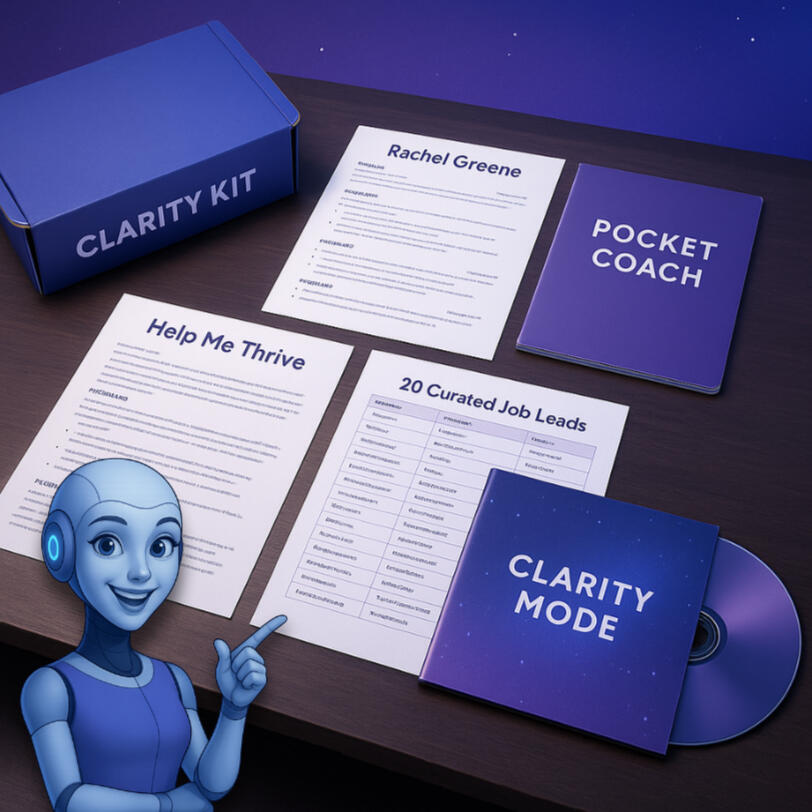 Answer: Your Clarity Kit includes:An ATS-optimized résumé for online applicationsA visually designed résumé for email or in-person sharingA Pocket Coach with interview prep, mindset support, and job tipsAn optional Help Me Thrive document to advocate for your needs at work20 handpicked job leads tailored to your strengths and goals