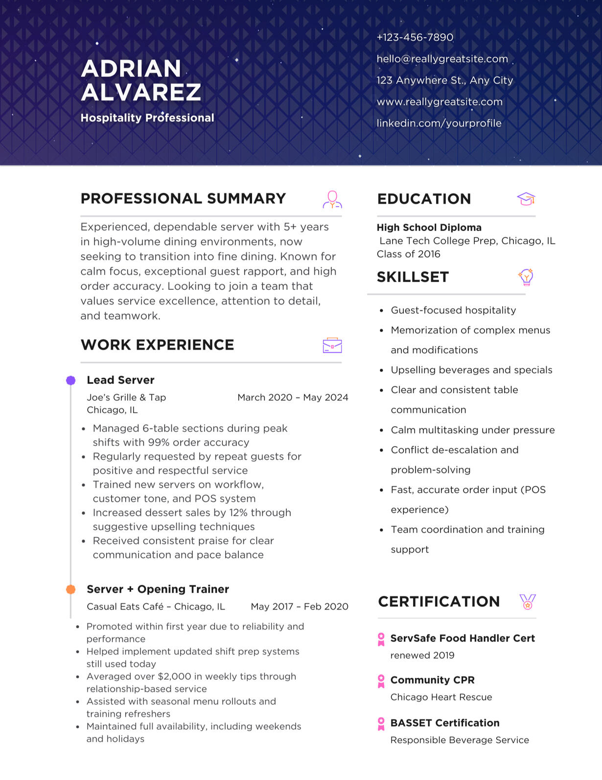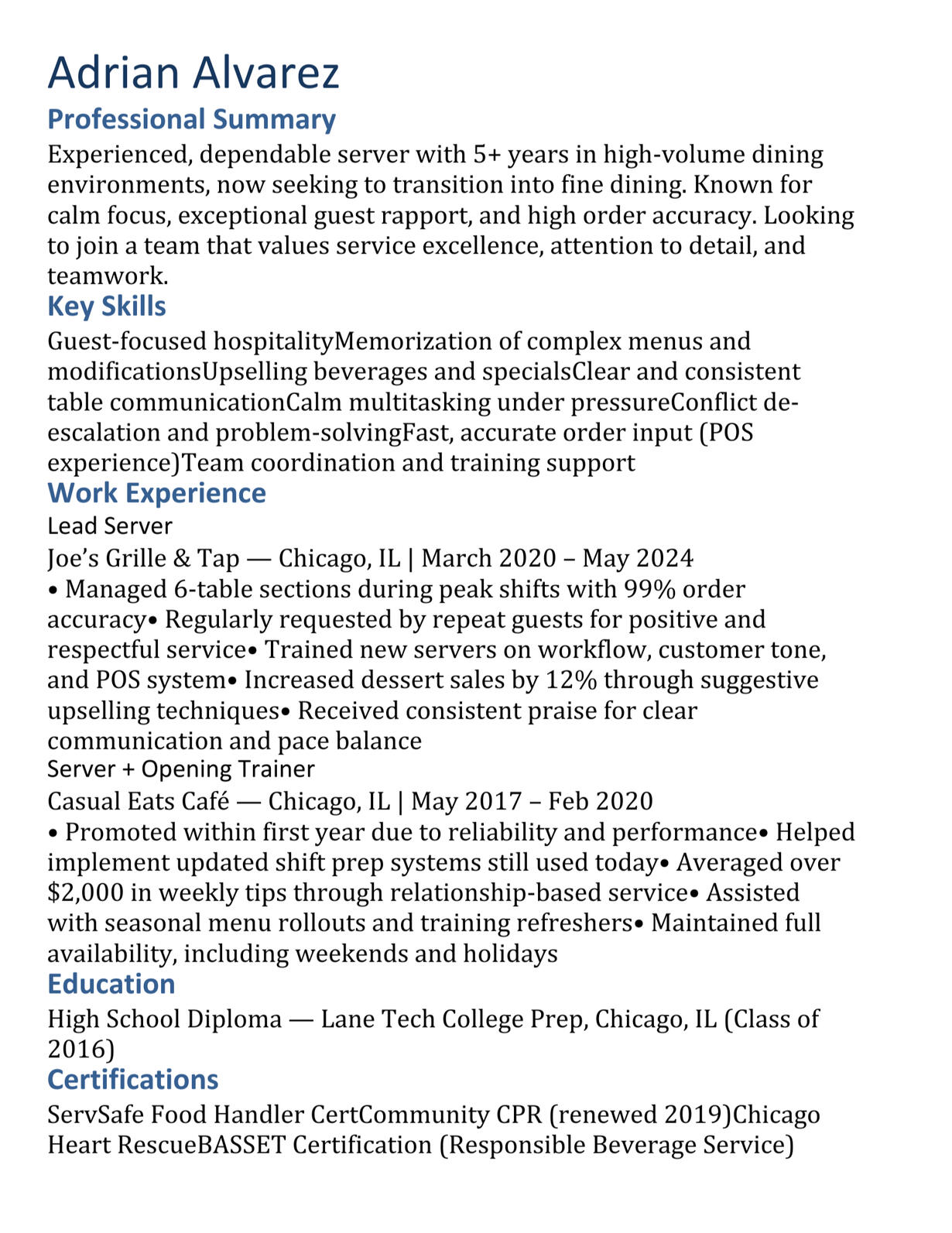 | 📝 “I’ve never worked fine dining, but I’m always top in tips.” | Summary: Calm, accurate, guest-focused — ready for fine dining Experience: Averaged $2K+ in weekly tips Why it works: Shows high performance and readiness to level up |